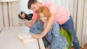 A brunette bimbo with small tits kisses a guy and she gets her pussy kissed