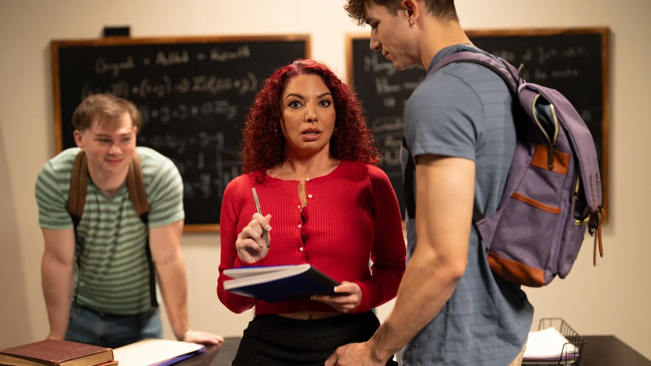 A beautiful, curvy redhead offers her glorious butt to one of her students while gifting an exquisite blowjob to the other. Still, the threesome that follows isn't complete without two lovely cumshots sprinkling on that pretty face.